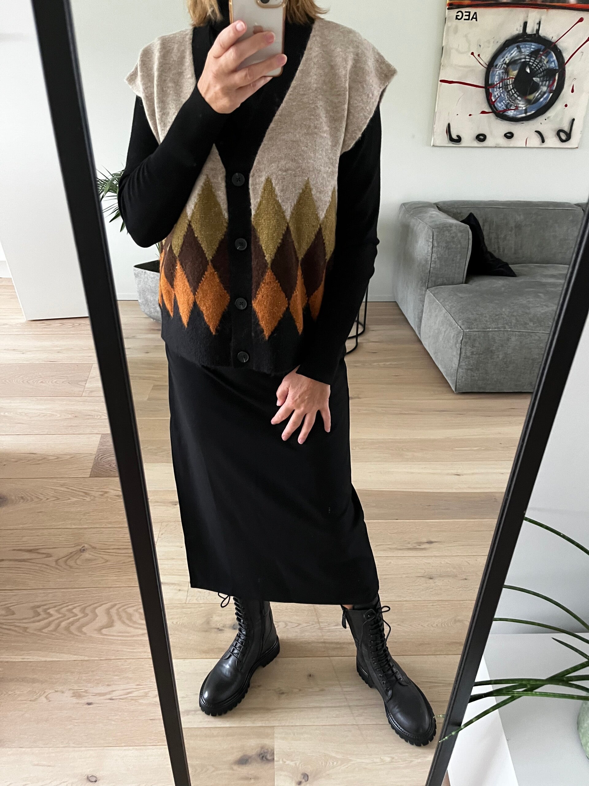 Aanpassend truitje, aan elke mouw onderaan 3 goudkleurige buttons.