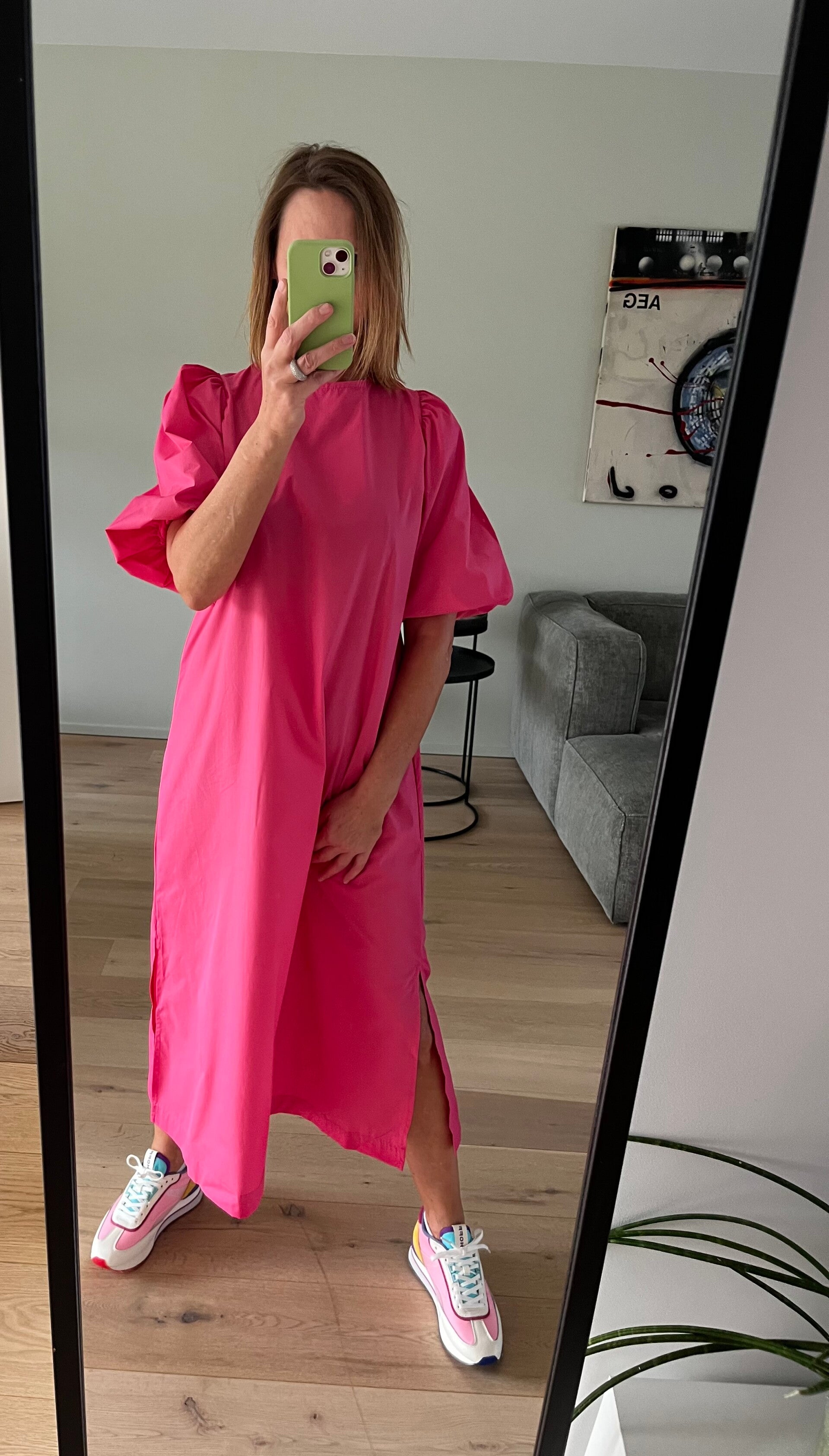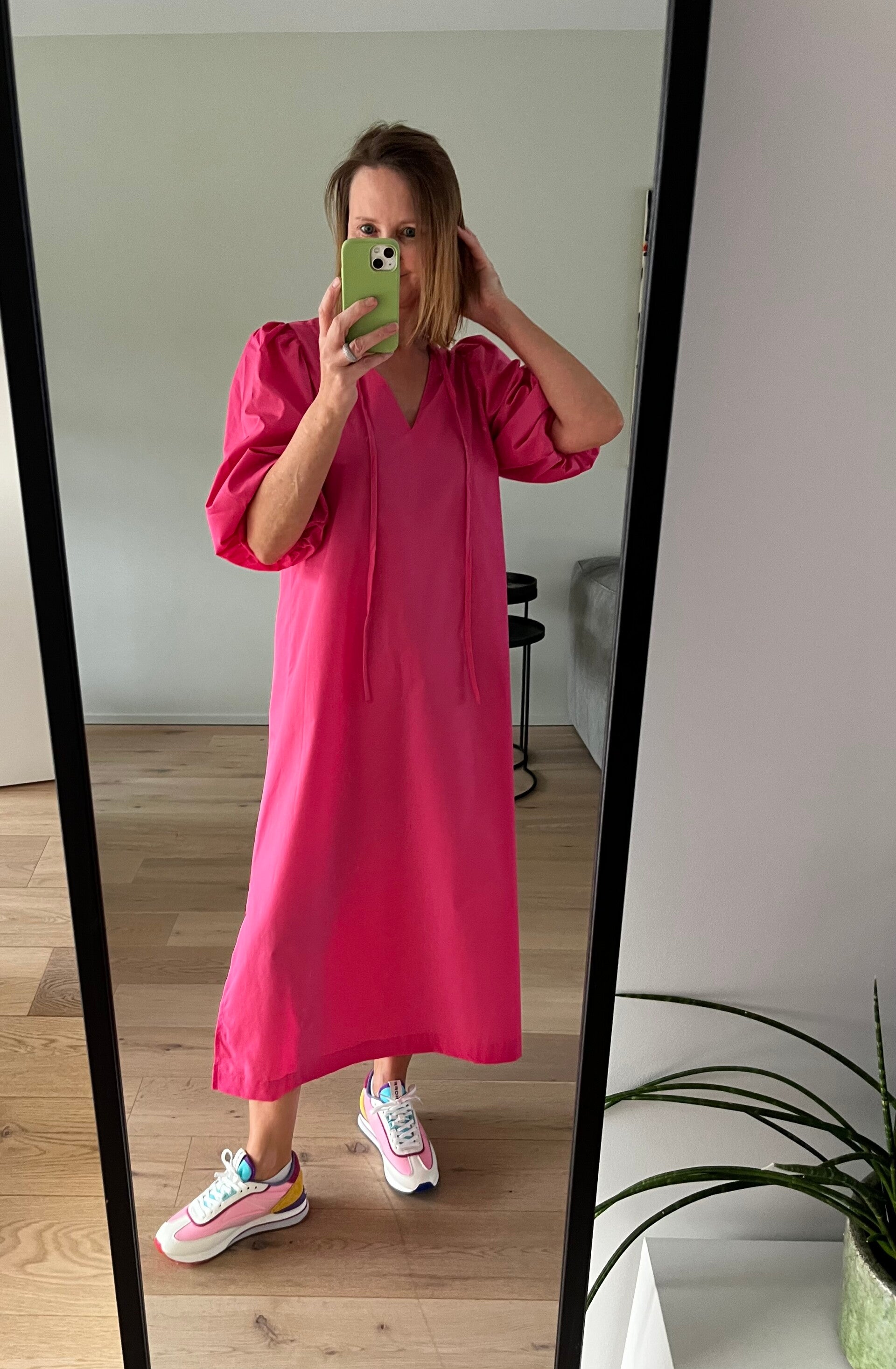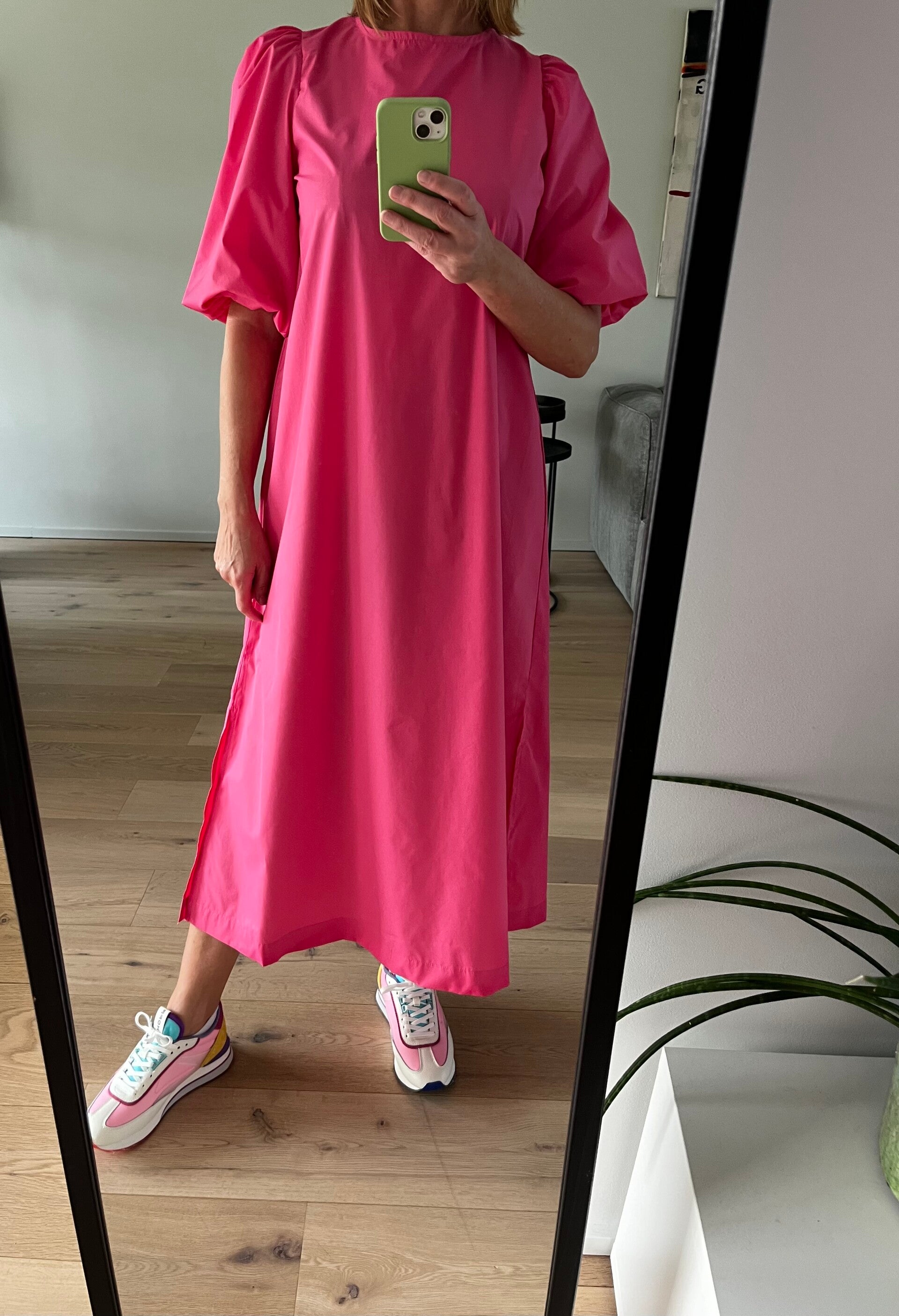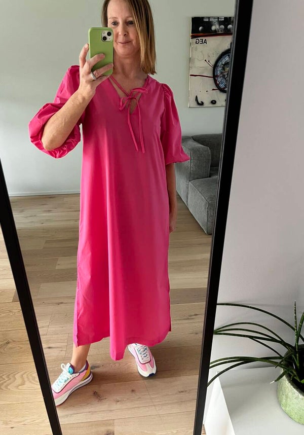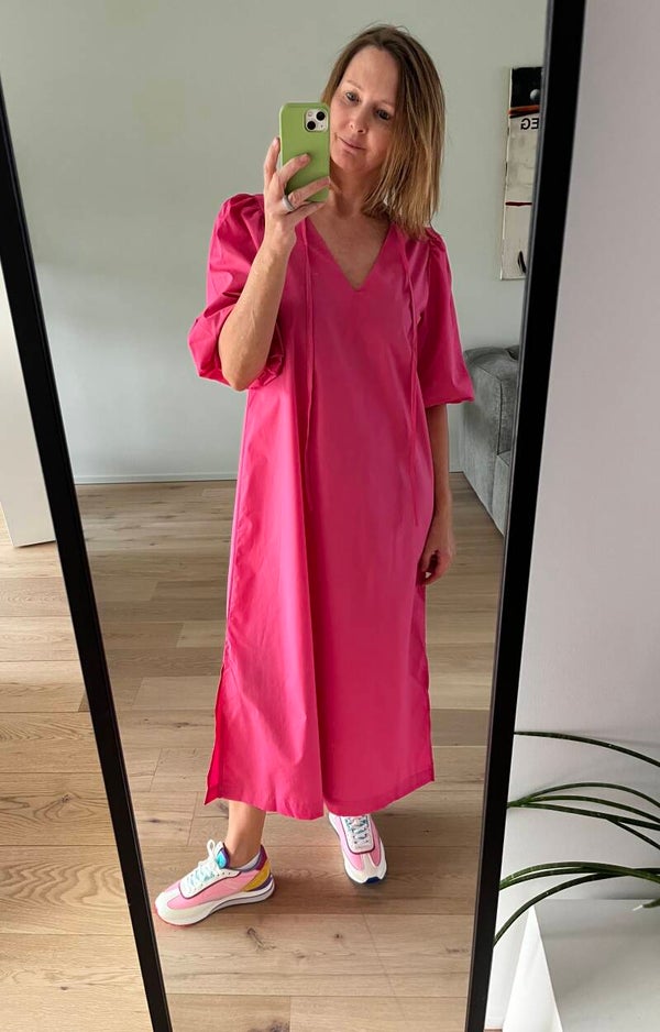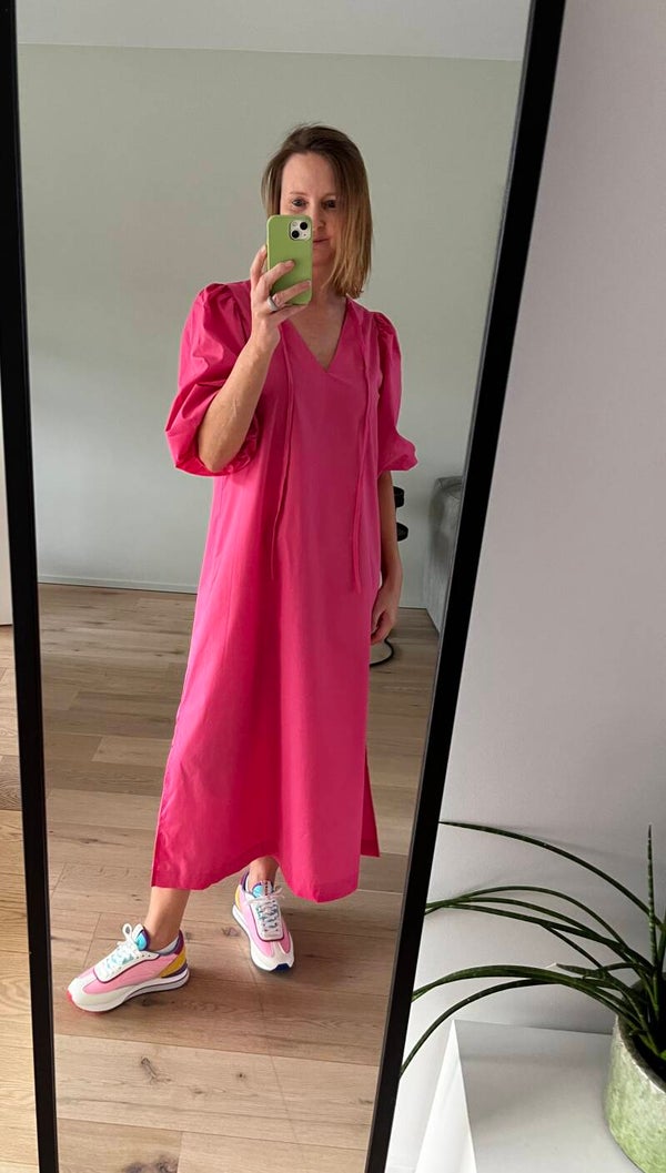 Deze jurk kan je op 2 manieren dragen: ronde hals vooraan of v-hals vooraan. 2 voor de prijs van 1 :-)