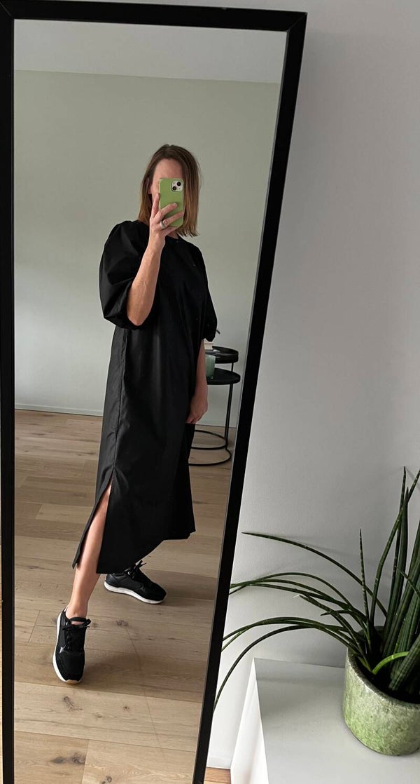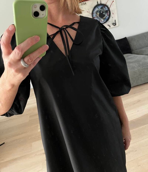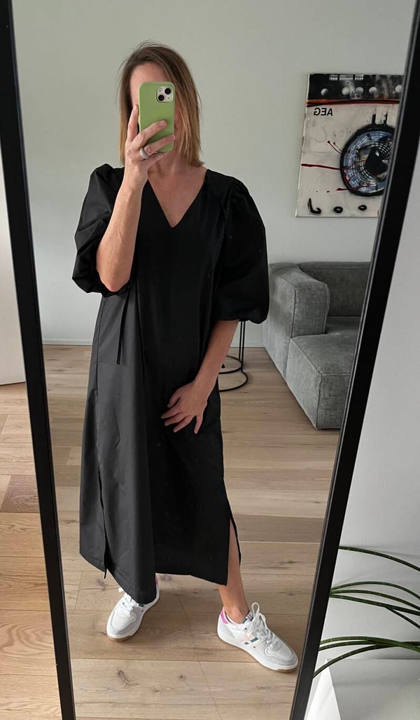 Deze jurk kan je op 2 manieren dragen: ronde hals vooraan of v-hals vooraan. 2 voor de prijs van 1 :-)